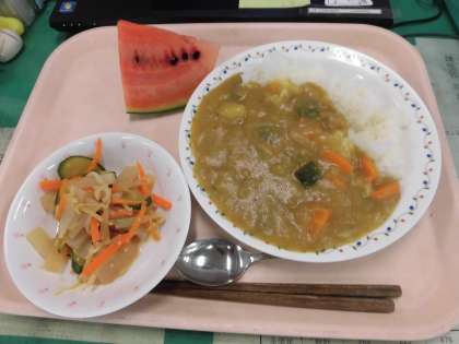 今日の給食は、 夏野菜のカレーライス こんにゃくサラダ スイカ