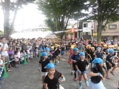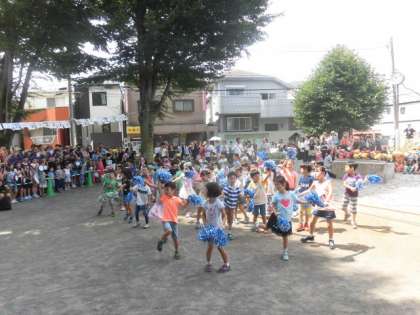 よい天気の中、13回目の千駄山町会のふれあいまつりが行われました。今年も1年生から4年生が運動会でおどったダンスを披露しました。たくさんの人が近くで見ていましたが、みんな元気に踊っておまつりを盛り上げました。
