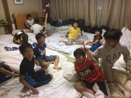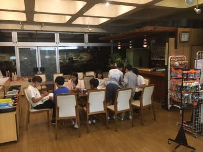 班長の反省会、保健係の健康カードの確認が終わると今日の活動は終了。明日のハイキングに備えてしっかり眠りましょう。おやすみさい。