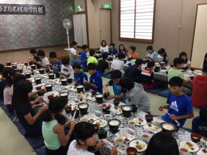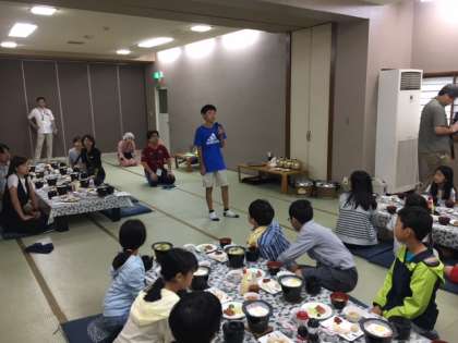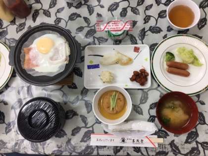 宿舎での最後の食事です。いつも美味しい食事をありがとうございました。しっかりと感謝の気持ちをもって食べましょう。メニューは、ベーコンエッグ、ウィンナー、がんもどきの煮物、笹かま、うずら豆の煮物、シュウマイ、なめこ汁、ごはん、ヨーグルトです。いただきます。