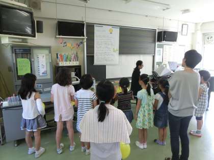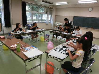 地域教室も5日目。本日の教室は2年生の「初めてのお習字」。まだ習ったこともない字を教えてもらいながら上手に筆を使って書くことができました。最後はオリジナルのうちわを作りました。1〜6年生のコーラスでは「ひまわりの約束」を歌いました。黄色い風船をもって声を2つのグループに分かれたりもして歌いあいました。
