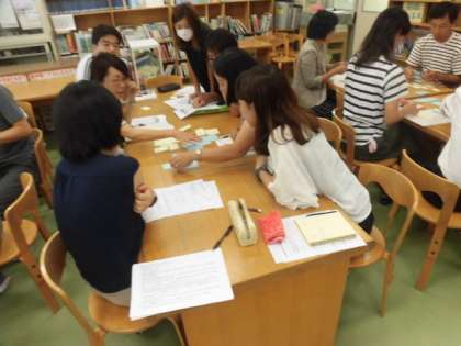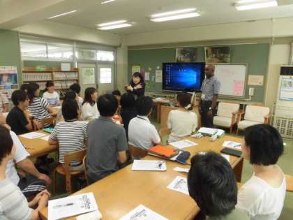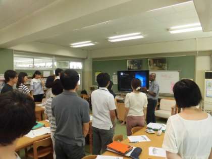 2学期がもうすぐ始まります。今日は、ALTを派遣していただいている業者の方を講師に、外国語活動の研修を行いました。新学習指導要領では、3・4年生が州1時間の外国語活動、5・6年生は2時間の外国語の授業を行います。これまでも外国語(英語)の指導を行ってきましたが、中々、全員で研修する時間はありませんでした。今日は、模擬授業をしてもらったり、みんなで子どもたちへの指示や発問の仕方を考えたり、実践的な研修になりました。2学期以降の指導に生かしたいと思います。