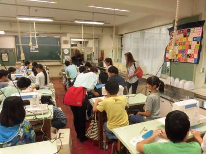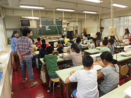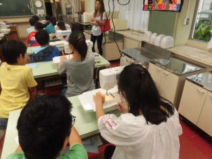 5年生は、家庭科でミシンの使い方を教わりました。保護者の方もお手伝いに来ていただきました。ミシンを上手に使って作品を完成させましょう。