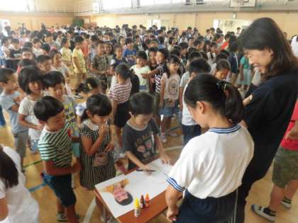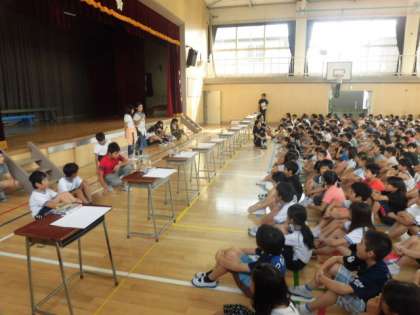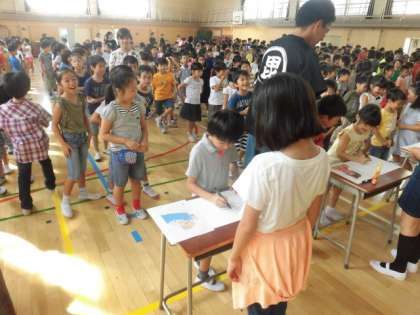 今日のゲーム集会は、「芸能人似顔絵描き」でした。学級ごと、示された芸能人の顔を順番に描いて仕上げていきます。特徴をよくとらえた似顔絵がたくさん出来上がりました。