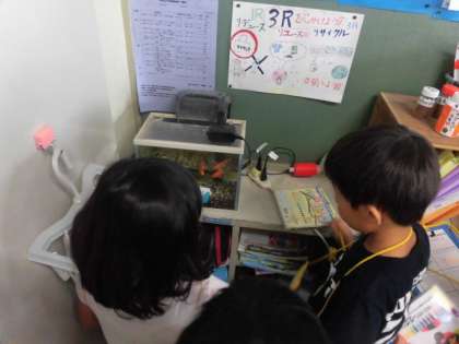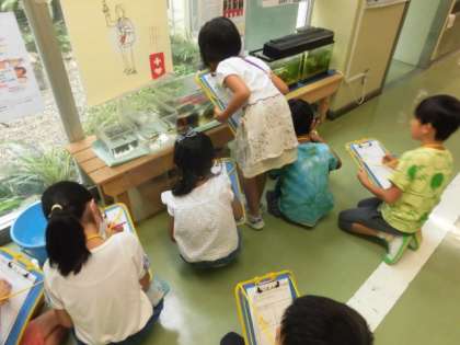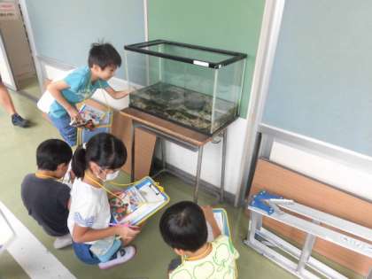 1年生が生活科の授業で、教室で飼われている生き物を観察にいきました。ウーパールーパーや亀、金魚など、しっかりと見て観察カードに絵をかきました。
