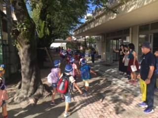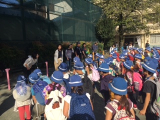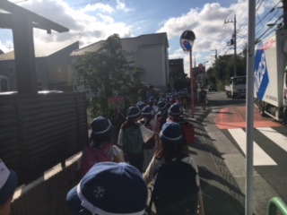 12年生が楽しみにしていた遠足。とってもいい天気の中、出発です。芦花公園駅まで学級でまとまって歩きます。間をあけずに頑張って歩きます。