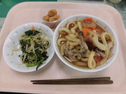 今日の給食は、ちゃんこうどん・やさいのごまあえ・お月見なので月見団子です。