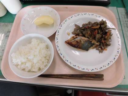 今日の給食は、」*ごはん *サワラの西京焼き *刻みこんぶの五目煮 *りんご です。