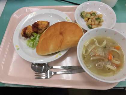 今日の給食は、*セルフフィッシュサンド *ヌードルスープ *ビーンズサラダ です。