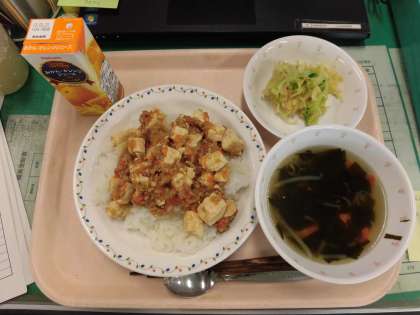 *マーボどうふどん *ちゅうかサラダ *わかめスープ *オレンジジュース でした。