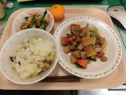 今日の給食は、*さつまいもごはん *がめに *やさいのおかかかけ *みかん です。