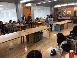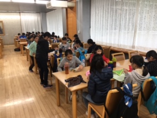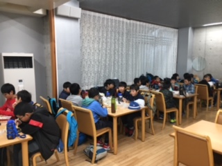 お部屋には、まだ入れないので、はじめに食堂でお弁当を食べます。お弁当の準備、ありがとうございました。美味しくいただきます。