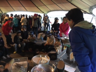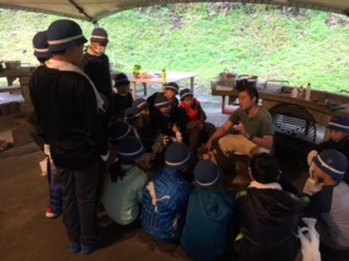 かまど係、カレー係、飯ごう係に分かれて説明を聞いています。それぞれの係、全て大切です。