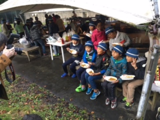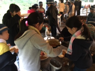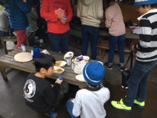 できあがった班からいただきます。少し早い夕飯ですが、自分たちで作ったカレーとごはん、美味しくいただきます。