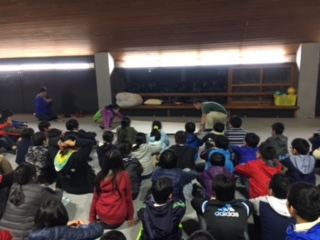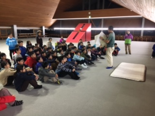 楽しかったキャンプファイヤーも終わり、布団の敷き方を教わっています。上手に敷けるでしょうか。この後は、お風呂です。ゆっくり疲れを取りましょう。