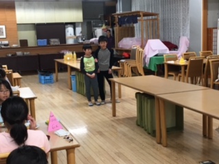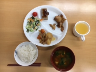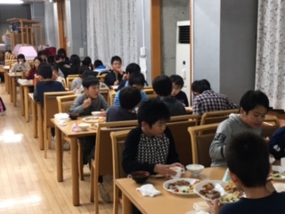 2日めの夕食です。食事係の準備も手際よくなり5分早くたべられます。たくさん歩いてお腹もぺこぺこです。たくさん食べましょう。献立は、ごはん、とりの照り焼き、肉じゃが、わかめサラダ、豆腐と青菜の味噌汁、こんにゃく、ミニトマト、りんごジュースです。いただきます。