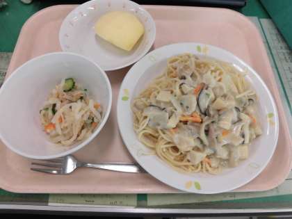 今日の給食は、*スパゲティキノコソース *大根とるなのサラダ *りんご です。