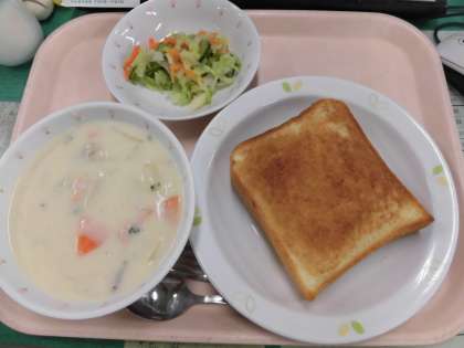 今日の給食は、*シナモントースト *シーフードシチュー *フレンチサラダ です。