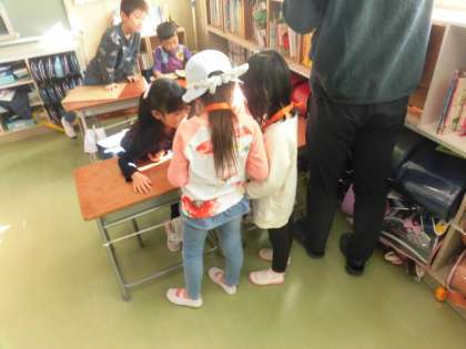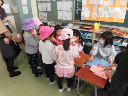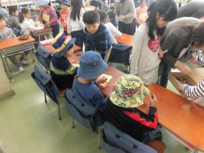 1年生が、近隣の保育園の友達を招待して「たからものランド」を開催しました。これまで生活科でドングリや落ち葉を使って作ってきたものをお店にして、楽しんでもらいました。最初は恥ずかしそうにしていた保育園の子どもたちも、1年生にやさしく教えてもらいながら楽しんでいました。小学校では一番下の学年の1年生も、今日はお兄さん、お姉さん、元気に保育園の子をリードしてたくましく過ごしました。1年生も保育園の子もみんな笑顔で過ごしました。