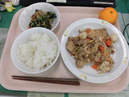 今日の給食は、*ごはん *すきやきに *やさいのごまあえ *みかん です。
