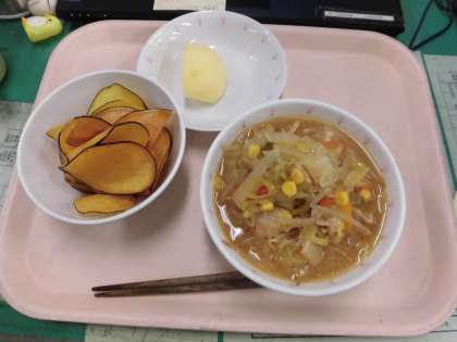 今日の給食は、*味噌ラーメン *スウィートポテトフリッツ *りんご です。