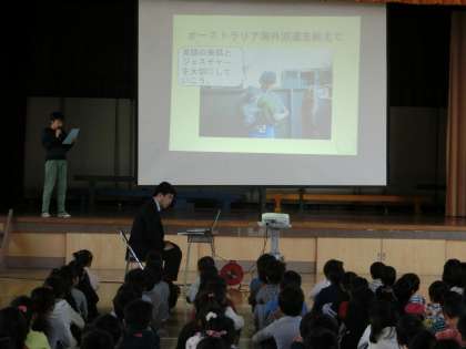 11月に世田谷区の代表としてオーストラリアに本校から派遣した5年生の児童の報告会を行いました。オーストラリアでホームステイをしてステイ先の方々とジェスチャーや英語でコミュニケーションをとりながら楽しく過ごしことをしっかりと報告してくれました。この貴重な体験を今後に生かしてほしいと思います。