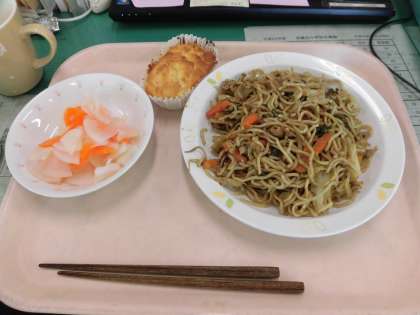 今日の給食は、*ソース焼きそば *大根のあまずかけ *リンゴマフィン です。