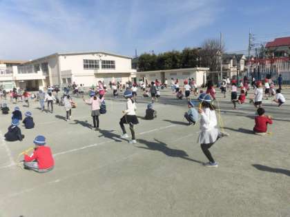 1月のハッスルタイムは、短なわです。音楽に合わせてみんなでとびます・1年生も一生懸命にとんでいます。たくさんの技ができるよう、休み時間のたくさん練習しましょう。に