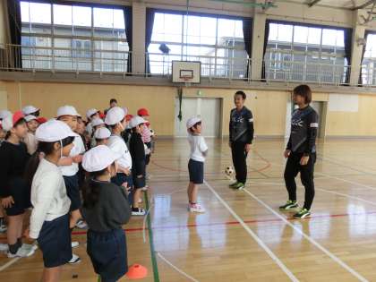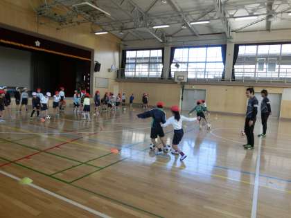 2年生は、体育の時間にJリーグで活躍され、今はサッカーの指導者として活動されている宇留野選手をお招きして、サッカー教室を開催しました。班対抗ドリブルリレーをしたりしながらボールのけり方などをしっかりと学びました。学んだことを、今度は自分たちでこれからのサッカーの授業に生かしてください。