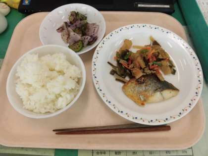今日の給食は、*ごはん *魚の西京焼き *大根のゆかりかけ *茎わかめのきんぴら です。