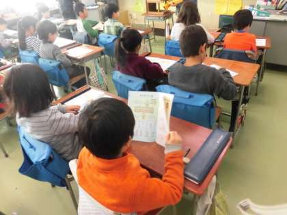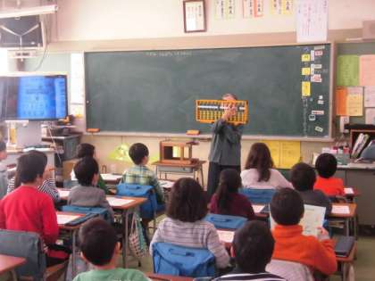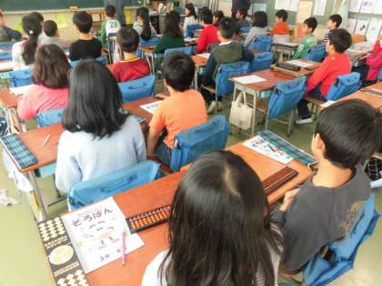 算数の授業でそろばんを習う3年生。今日から、専門の先生を招いての授業です。初めてそろばんに触る子どもいて、みんな真剣に話を聞いています。短い時間ですが、しっかりと練習しましょう。