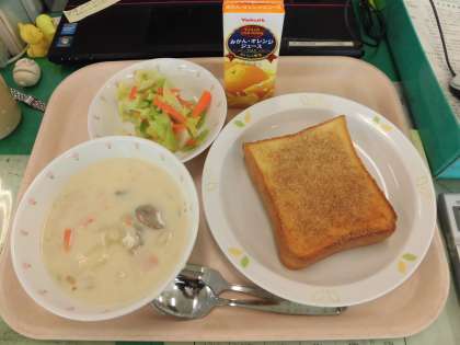 今日の給食は、*セサミトースト *クリームシチュー *キャベツサラダ です。