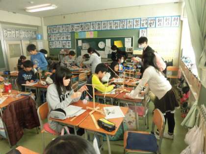 6年生が、計量の専門家である東京計量士会の方を招いて、理科や算数で勉強した計量単位についてお話を聞いたり、実際に「棒はかり」を作っていろいろな重さを測定する出前計量教室を行いました。専門家の人から計量単位について学ぶことで計量に興味をもったり、専門的な仕事があることにおどろいたりしました。