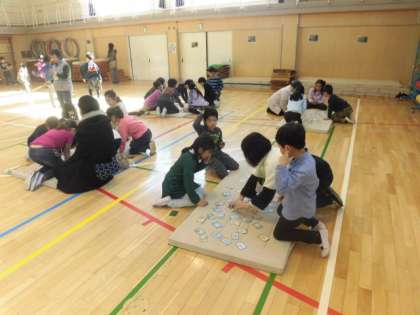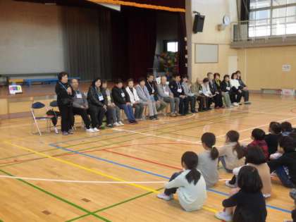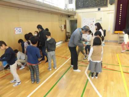 2年生は、体育館でいつもお世話になっている豊友会や地域の人を招いて「昔遊び」の会を行いました。たくさんの方に参加していただき、お話を聞いたり、昔の遊びを一緒にしたりして楽しい時間を過ごしました。