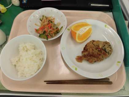 今日の給食は、*ごはん *とうふ入りハンバーグ *こんにゃくサラダ *いよかん です。