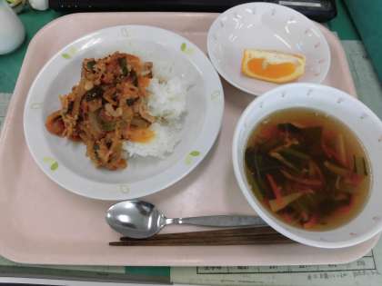 今日の給食は、*キムチ丼 *春雨スープ *いよかん です。