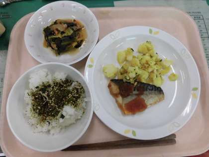 今日の給食は、*ごはん(ふりかけ) *魚の和風ソースかけ *粉ふきいも(カレー味)*にびたし