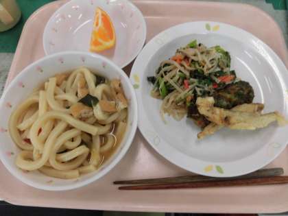 教の給食は、*煮込みうどん *天ぷら(ちくわ、ワカサギ) *野菜のごま和え *はるみオレンジ です。