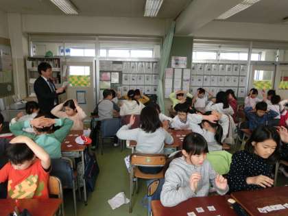 烏山中学校の英語の先生に4年生の外国語活動の授業をしていただきました。みんなで英語の歌を歌ったり、英語カルタをしたりして、楽しく英語を学びました。とても素直で元気な4年生と一緒に授業ができて楽しかったと烏山中学校の先生が言っていました。来年度は56年生の外国語の授業が70時間になります。今から楽しみですね。