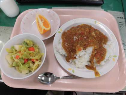 今日の給食は、*キーママレーライス *ポテト入りフレンチライス *清美オレンジ