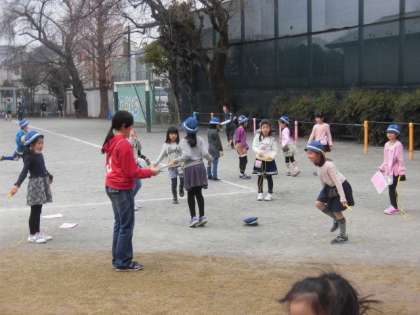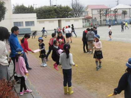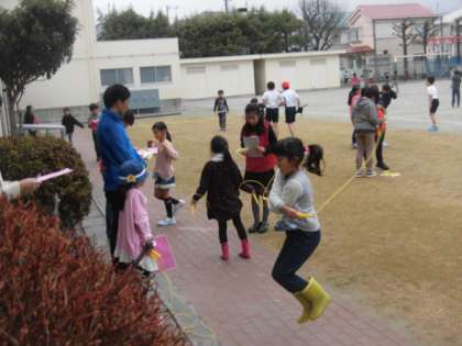 体育やハッスルタイムや中休みなどで短なわとびをがんばっている子どもたち。運動委員の人が検定のお手伝いもしてくれています。合格のシールをもらってうれしそうです。
