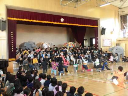 3年生は、6年生が昨年度の学芸会で演じた「象列車は走る」をアレンジした劇、4年生は、詩「歩けあるけ」の群読、5年生は6年生から教えてもらった「カノン」のリコーダー演奏でお祝いです。各学年の出し物を見ている6年生のやさしい顔が印象的です。