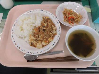 今日の給食は、 *麻婆豆腐丼 *野菜の中華かけ *中華スープ です。