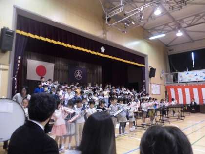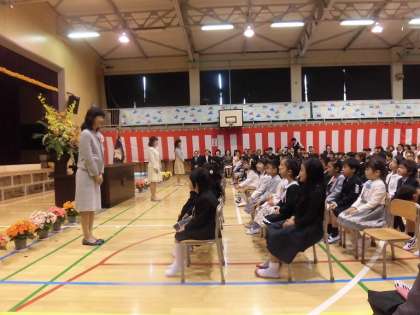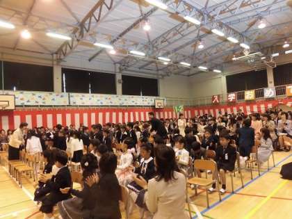 あたたかい拍手の中入場して入学式が始まりました。校長先生の話も聞いて「へんじ」「あいさつ」「あとしまつ」の約束もしっかりとできました。6年生の歓迎の言葉、2年生の歓迎の演技も静かに聞くことができてとてもお行儀のよい1年生でした。これから一緒に生活するのが楽しみになる入学式でした。