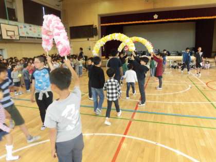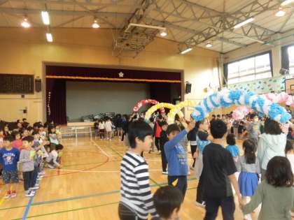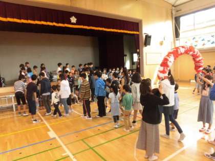 今日は、6日に入学した1年生を全校で歓迎する「1年生を迎える会」です。入学式と同じように6年生に手をつないでもらっての入場です。体育館には2年生から5年生が1年生が来るのを楽しみに待っていました。