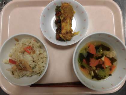 たけのこごはん・ちくわの二色揚げ・豆腐汁