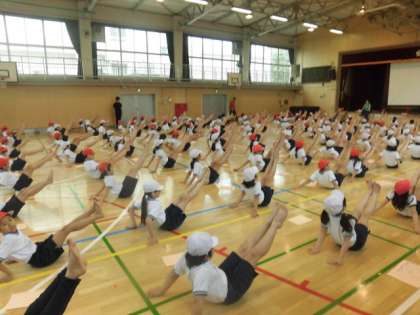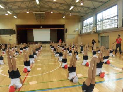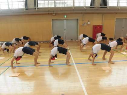 今日は一人で行う、肩倒立、ブリッジ、V字バランスの練習をしました。お手本の6年生を参考に5年生も集中して取り組みました。みんなが揃うととてもきれいです。