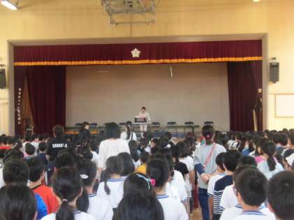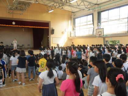 今年度最初の音楽集会を行いました。明日の離任式で歌う「ありがとう さよなら」と「校歌」をみんなで練習しました。1年生は、離任式には参加しませんが、学級で覚えてきた校歌を元気に歌いました。明日は、離任式です。みんなの歌声で感謝の気持ちを表しましょう。