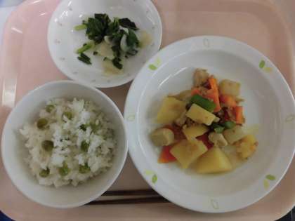 グリンピースごはん・新じゃがのそぼろ煮・かぶのレモンしょうゆかけ