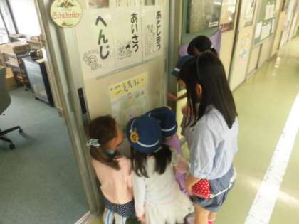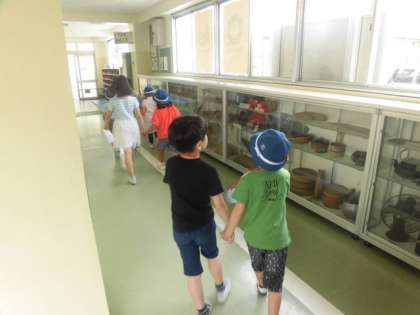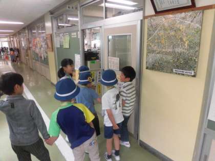 今日は、2回目の学校探検。2年生が手をつないで案内です。案内の仕方も上手になりました。1年生も2年生のお話をしっかりと聞いています。